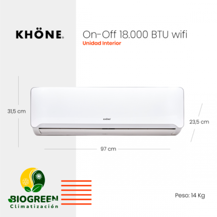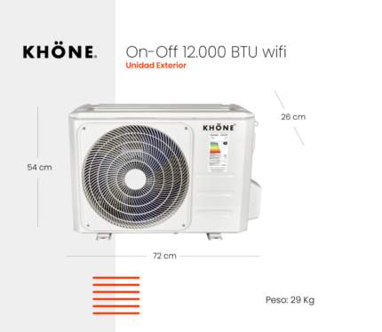 Afuera no puedes controlar el clima, pero adentro si. Climatizador (frío y calor) que le dará a tu hogar un clima perfecto todos los días del año, tecnología On-Off. La perfecta combinación de funcionalidad, desempeño y rendimiento en un equipo de gama de entrada. Función WiFi incorporada (app Khöne Control) para poder controlar el clima de tu hogar desde donde quieras. Recomendado para áreas de hasta 48m2 (en condiciones óptimas de aislamiento).
